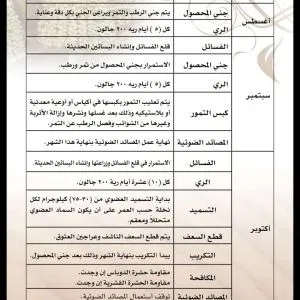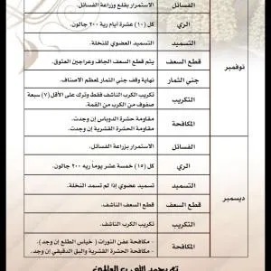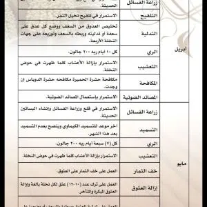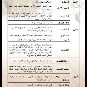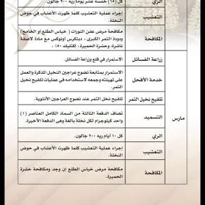 سماد سابك للنخيل يتم تسميد فسائل النخيل بعد تأكد تكوينها لمجموعها الجذري بصورة جيدة وتامة. كذلك لابد من اضافة خدمة أرضية جيدة قبل عملية الغرس كما أشرنا في هذا التقرير. ويمكن تسميدها علي مدار العام مع مزروعاتك الأخري في المزرعة أو تخصيص برنامك تسميدي كما نوهنا سابقاً. زيادة حجم ثمار النخيل زيادة حجم ثمار النخيل هي عملية مركبة تتم في مدي زمني واسع وليس في مرحلة معينة من عمر الثمرة فقط. ويبدأ تحجيم الثمار بداية من الخدمة الشتوية الجيدة للنخلة ومروراً بعمليات التقليم والتكريب وجميع العمليات الفنية . وينتهي بمرحلة تطور نمو الثمرة ، وفي العموم يمكننا القول أن الإهتمام بالاسميد بعنصر البوتاسيوم له دور كبير في تحجيم ثمار النخيل. ويمكنك اضافة البوتاسيوم منفرداً علي دفعات تبدأ من مرحلة عقد الثمار كدفعة أولي ثم يتم اضافة الدفعة الثانية في شهر بونيو بمعدل 2 : 4 كجم في كل مرة . جدول العناية بالنخيل جدول العناية بالنخيل يكون طول العام ، وقد تم نقله من كتاب العناية بالنخيل لصاحبه الدكتور جاسم محمد حمد المديرس : https://www.arabsharing.com/do.php?img=255020 https://www.arabsharing.com/do.php?img=255021 https://www.arabsharing.com/do.php?img=255022 https://www.arabsharing.com/do.php?img=255023 https://www.arabsharing.com/do.php?img=255024 https://www.arabsharing.com/do.php?img=255025 |
